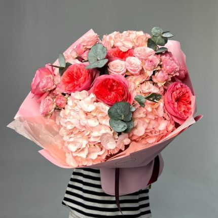 Авторская композиция из гортензий, роз и ранункулюсов в шляпной коробке