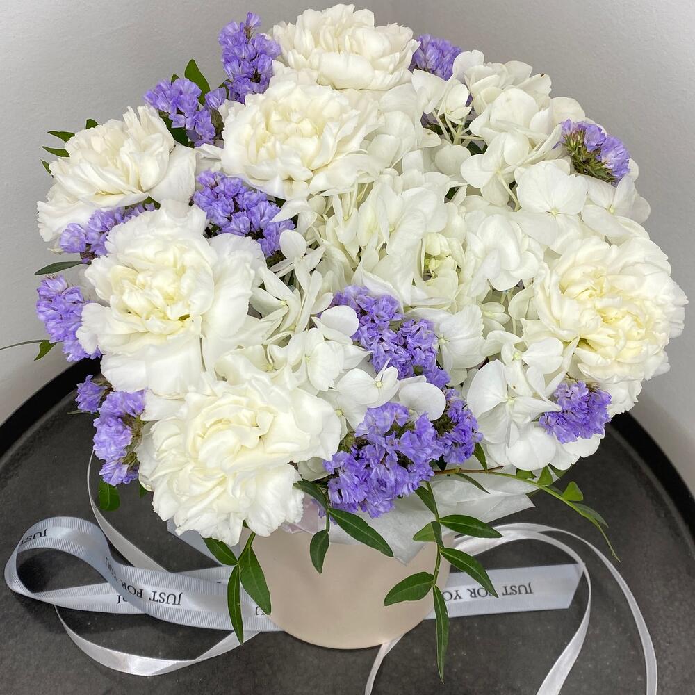 Гортензия – 1 шт.Статица – 2 шт.Тишью – 1 шт.Коробка шляпная – 1 шт.Пистакия – 2 шт.Оазис флористический – 1 шт.диантусы – 6 шт.