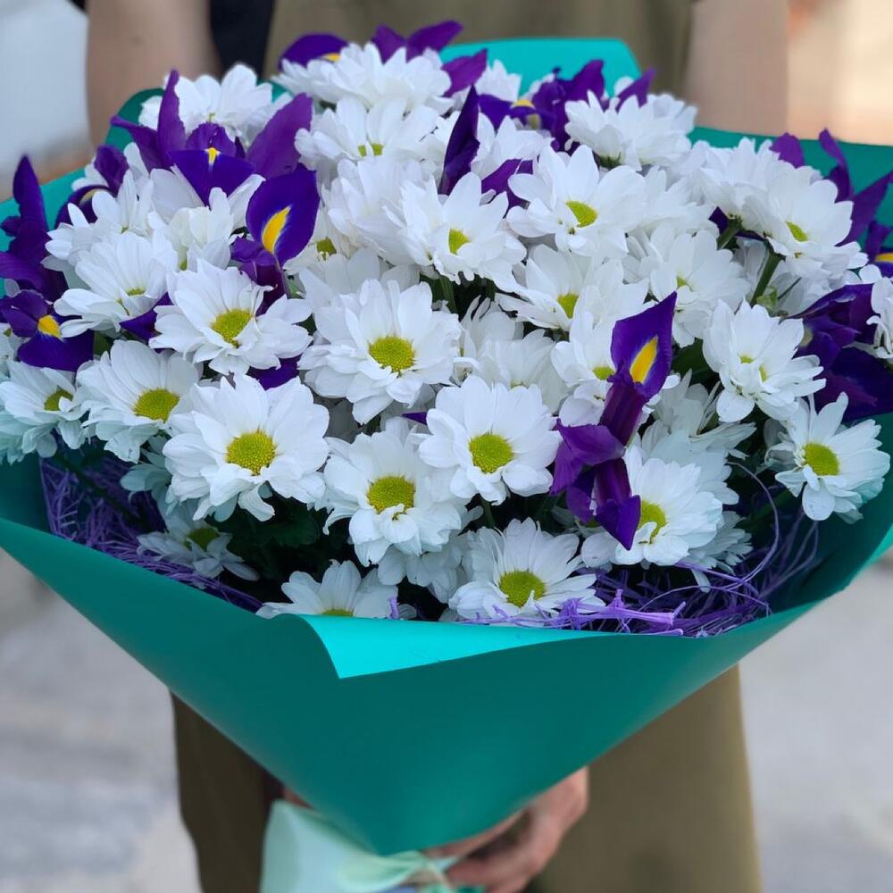 Хризантема Бакарди – 9 шт.Ирис Blue Magic – 9 шт.Зелень – 5 шт.Упаковка дизайнерская – 1 шт.