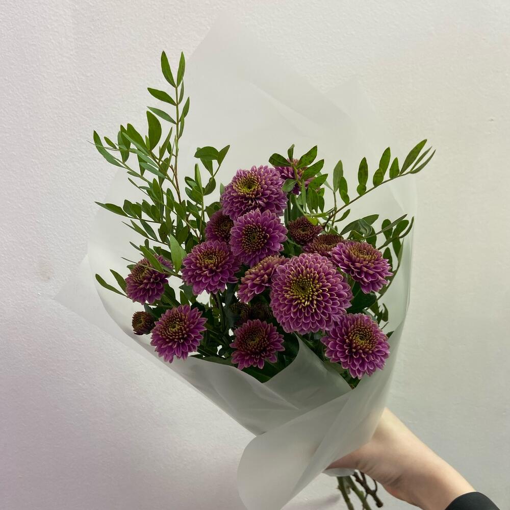 Хризантема Сантини – 3 шт.Фисташка – 2 шт.Матовая пленка – 1 шт.