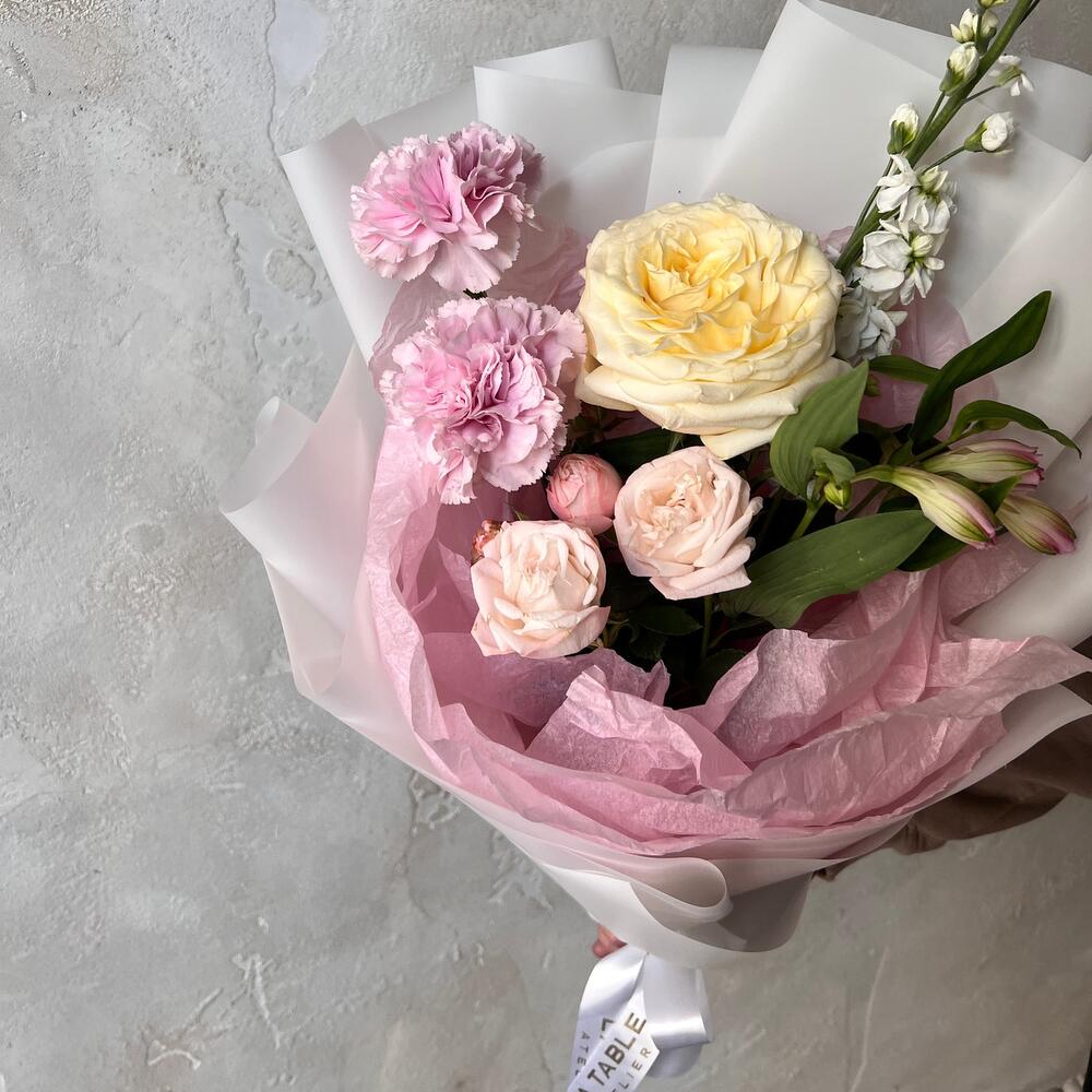 Альстромерия – 1 шт.Маттиола – 1 шт.Роза кустовая – 1 шт.Упаковка дизайнерская – 1 шт.Одноголовая роза – 1 шт.
