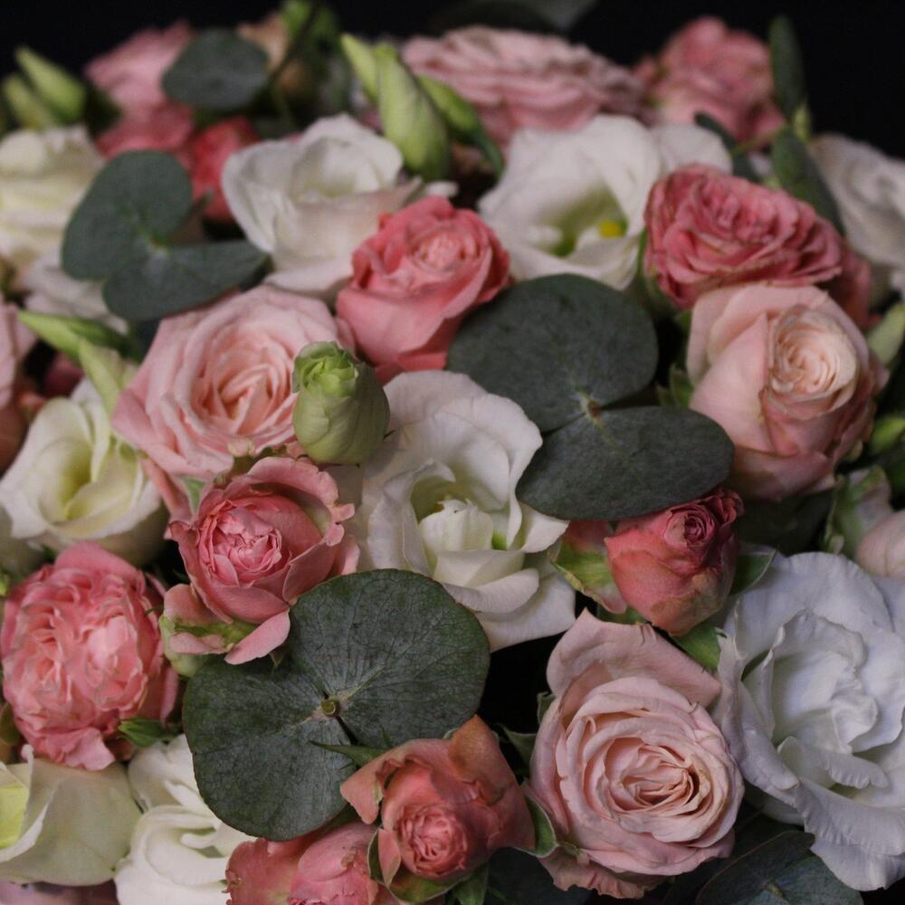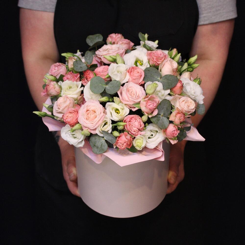 Эвкалипт – 2 шт.Шляпная коробка – 1 шт.Оазис флористический – 1 шт.эустома белая – 3 шт.Роза кустовая пионовидная мадам бомбастик – 6 шт.Пленка дизайнерская – 1 шт.