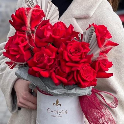 Шляпная коробка с гвоздикой, кустовой розой, гиперикумом, кустовой хризантемой “Фруктовые леденцы”